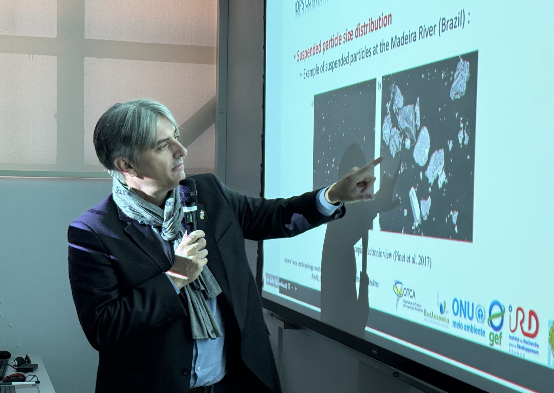 - Clase teórica sobre el monitoreo espacial del transporte de sedimentos en la Amazonía, impartida por el instructor Jean-Michel Martinez (IRD).