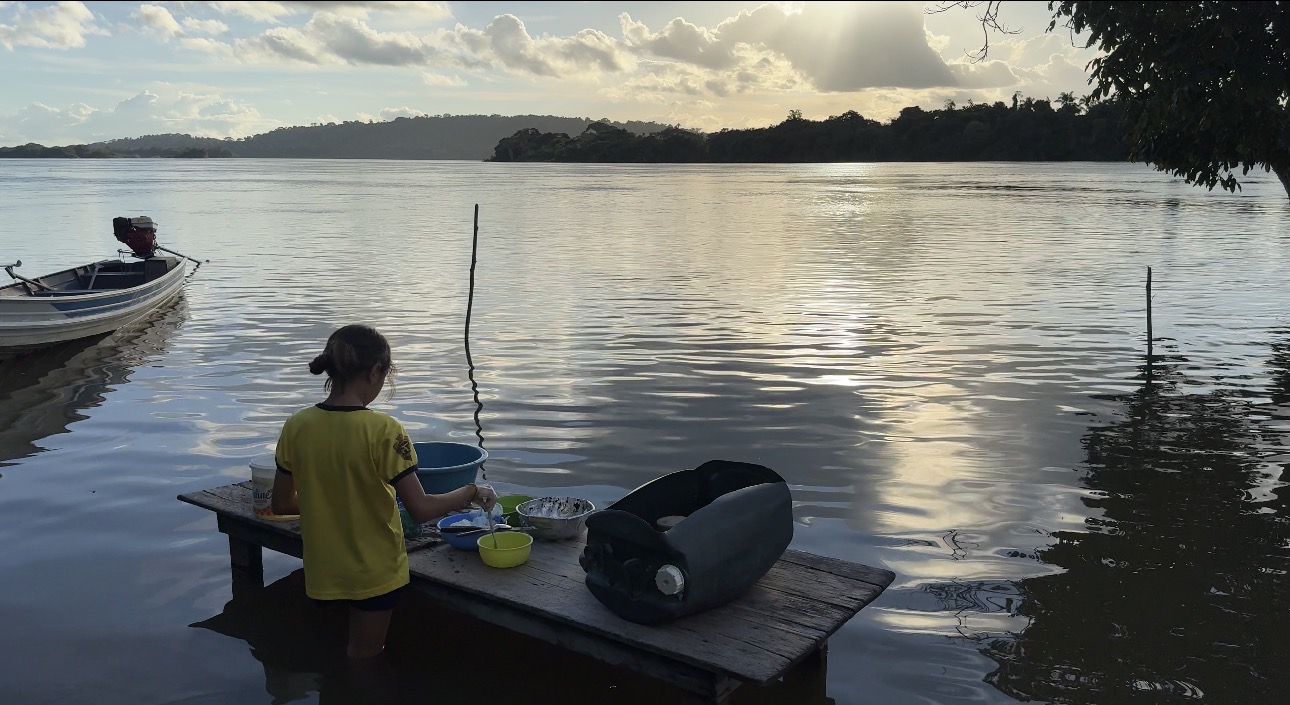 - Menina lava louça à beira de rio na Amazônia, tarefa cotidiana frequentemente assumida por mulheres desde cedo nas comunidades ribeirinhas.
