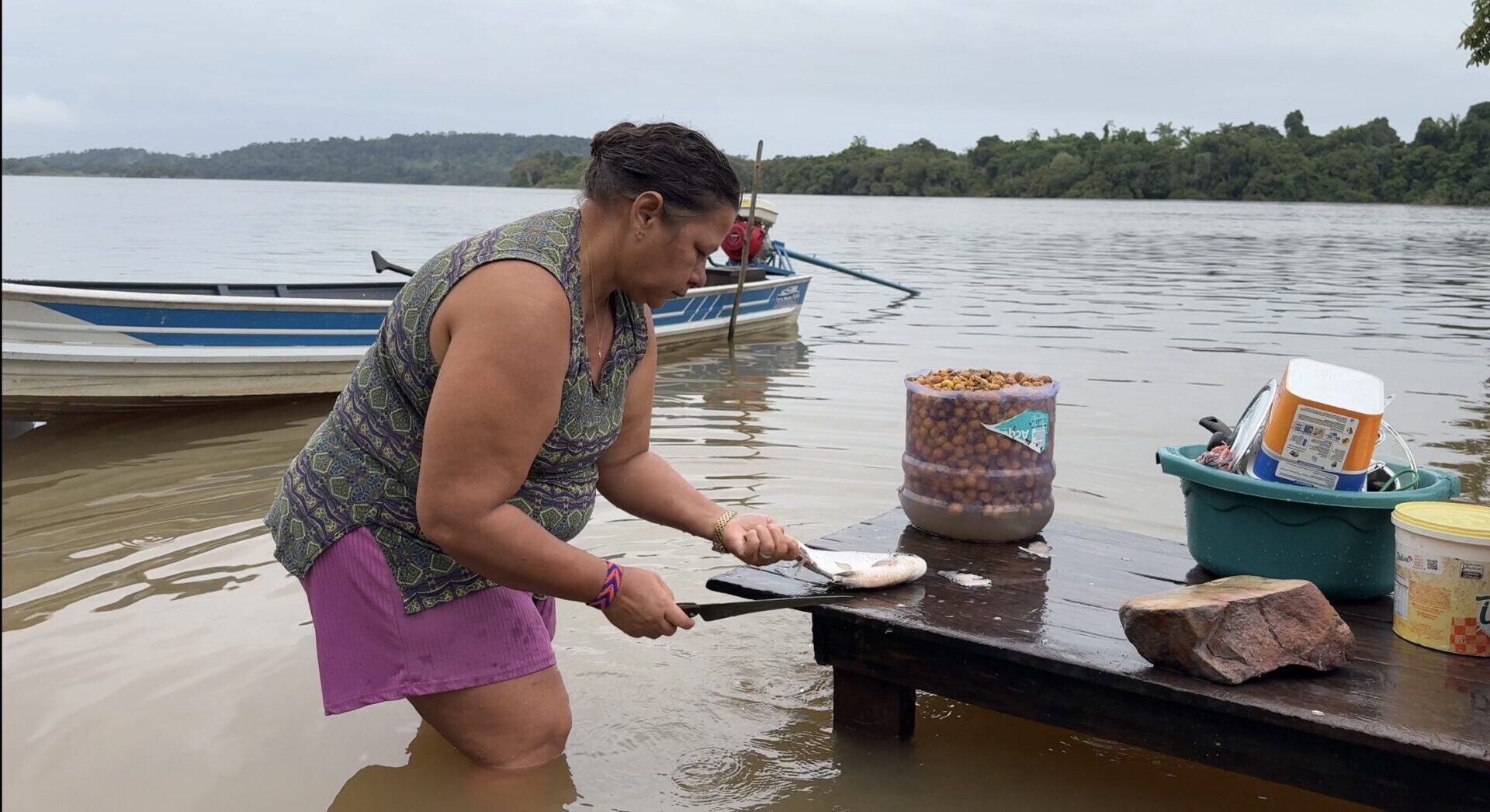 - Mujer amazónica prepara pescado a la orilla del río para cocinar, una actividad tradicionalmente realizada por mujeres en las comunidades ribereñas.