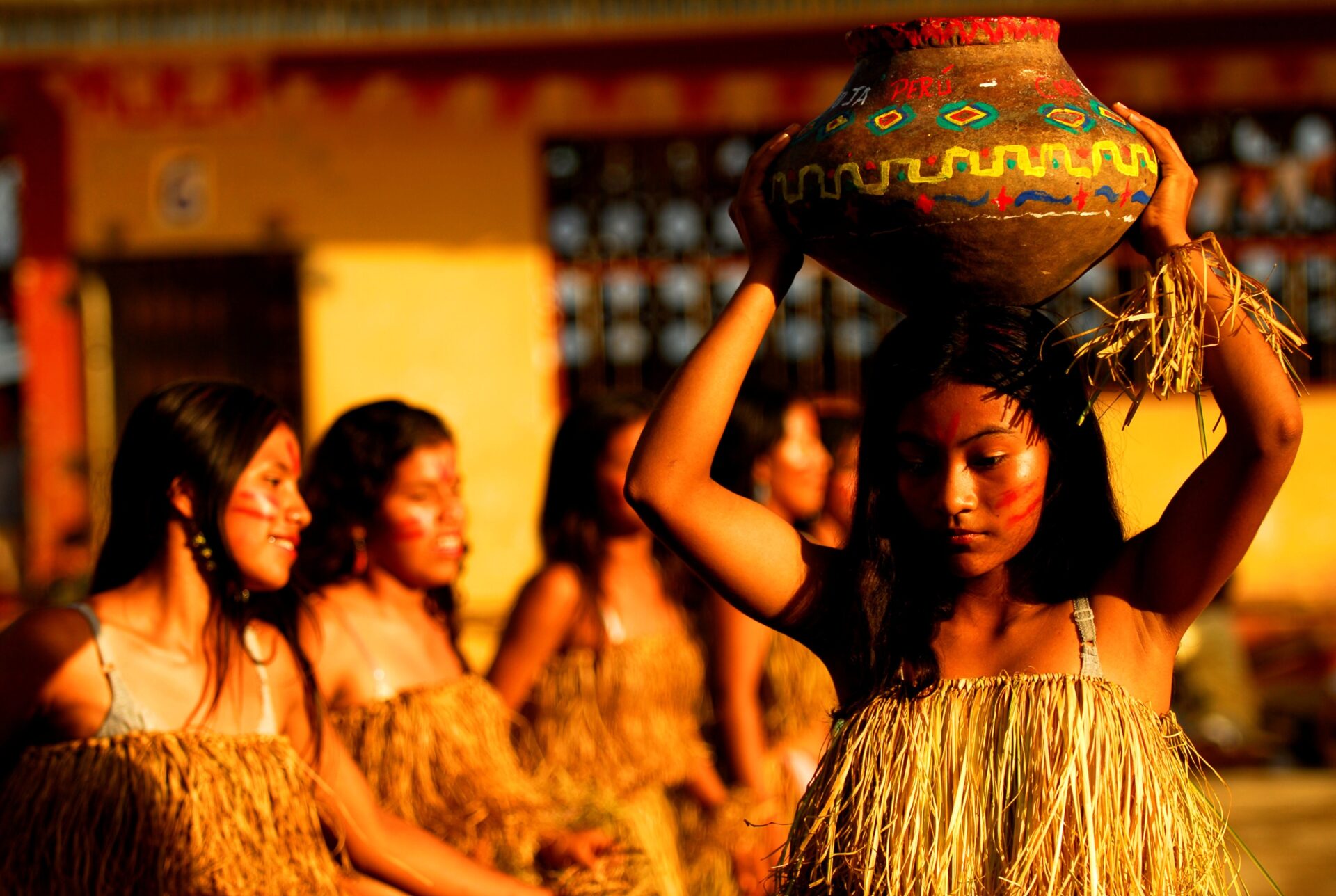Mulher indígena da Amazônia brasileira carregando pote com água