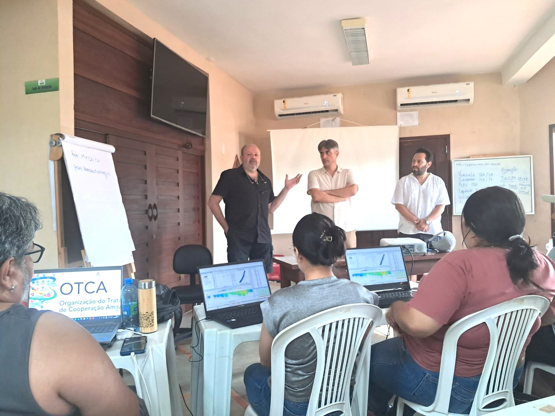 Un grupo de 20 profesionales técnicos de instituciones responsables del monitoreo hidrológico en los países amazónicos participó en el Curso de Hidrología Amazónica, organizado por el Proyecto Cuenca Amazónica (OTCA/PNUMA/GEF) del 7 al 13 de octubre en la ciudad de Novo Airão, en la Amazonía brasileña. Esta iniciativa, en asociación con el Instituto Francés de Investigación y Desarrollo (IRD), el Departamento de Geociencias de la Universidad Federal del Amazonas (UFAM) y la Superintendencia del Servicio Geológico de Brasil (SGB), promovió la nivelación de competencias para apoyar el funcionamiento de la Red Hidrológica Amazónica (RHA), que opera en el Observatorio Regional Amazónico (ORA) de la Organización del Tratado de Cooperación Amazónica (OTCA). El curso abordó temas hidrológicos como el monitoreo de niveles y caudales de ríos y reservorios amazónicos, incluyendo la construcción de modelos y la observación de la variabilidad fluviométrica a partir de datos satelitales.
